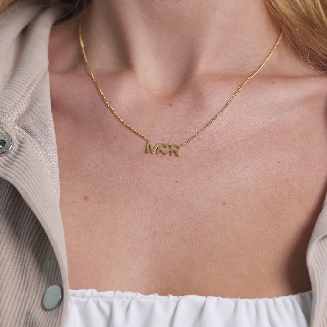 Personling halskæde med M♡R. Guldhalskæden er forgyldt med 18 karat guld. Flot og stilrent design med skriften M♡R.