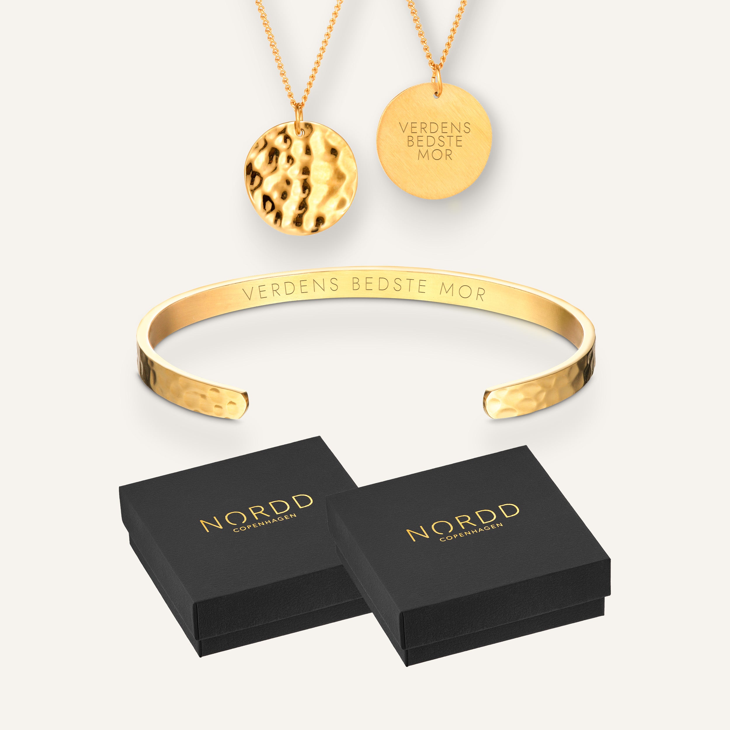 Verdens bedste mor gavesæt hammered af vores populære "Verdens bedste mor - hammered 02" og "Verdens bedste mor (hammered)" armbånd.